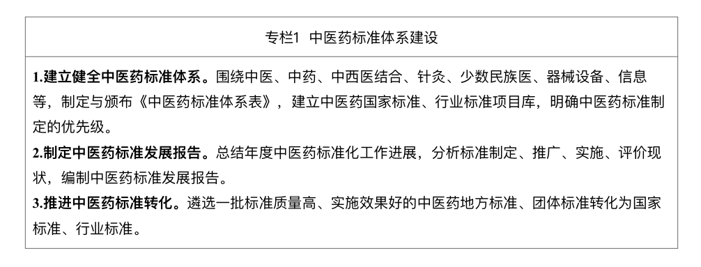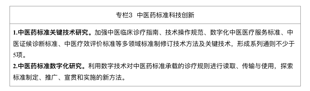 1.深化中医药标准化理论、方法、技术研究。夯实中医药标准科研基础,利用科技创新助推标准水平提升,推进中医药标准化方法、原理创新,开展中医药标准全生命周期的共性技术研究,围绕中医标准制定的关键技术环节,形成系列共性关键技术通则,显著提升共性关键技术标准数量。
