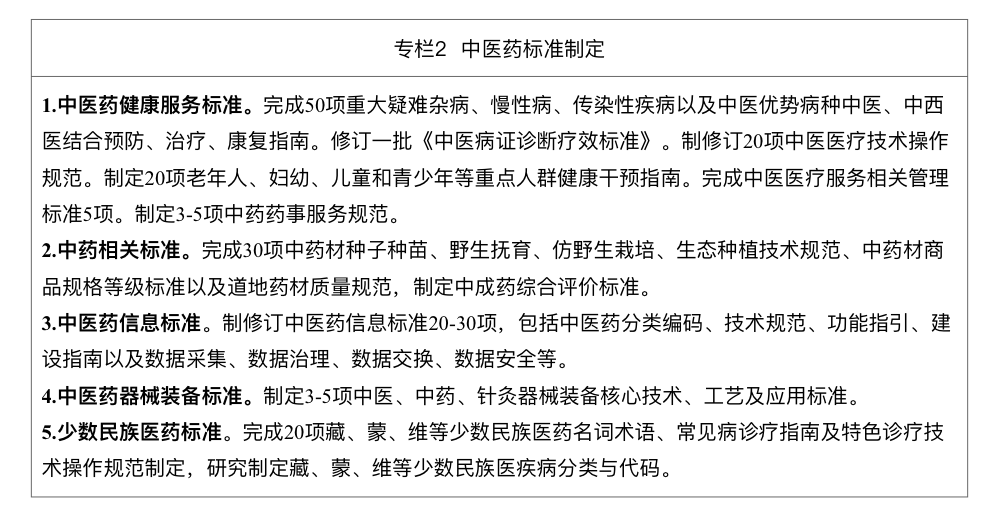 2.强化中医药国家标准和行业标准。提高基础通用、与强制性国家标准配套、对行业起引领作用的国家标准以及中医药行业的产品、技术、服务和管理标准的数量和质量,满足中医药发展需求,提高中医药国家标准、行业标准的通用性和覆盖面。