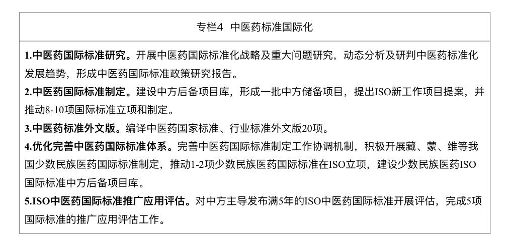 3.推动国内国际标准相互促进转化。加大中医药国际标准动态跟踪、评估力度,发展和推动满足国际应用需求的中国标准转化为国际标准,积极采纳引用培育适合我国国情的国际标准。开展中医药国内国际标准一致性评价。