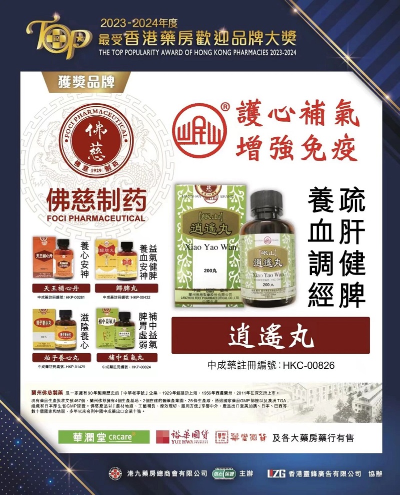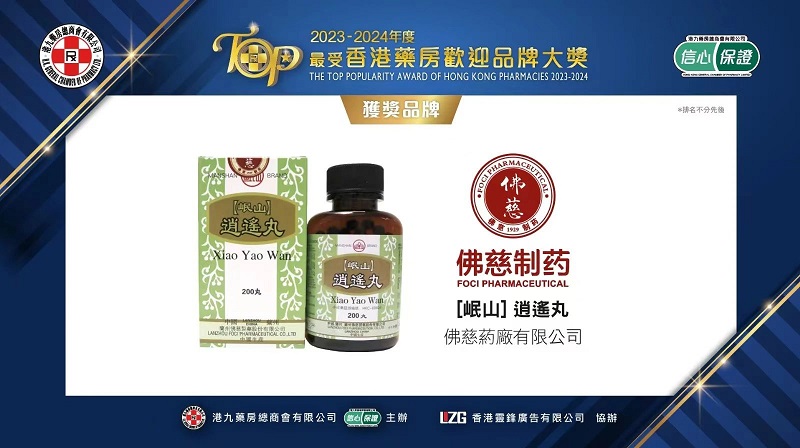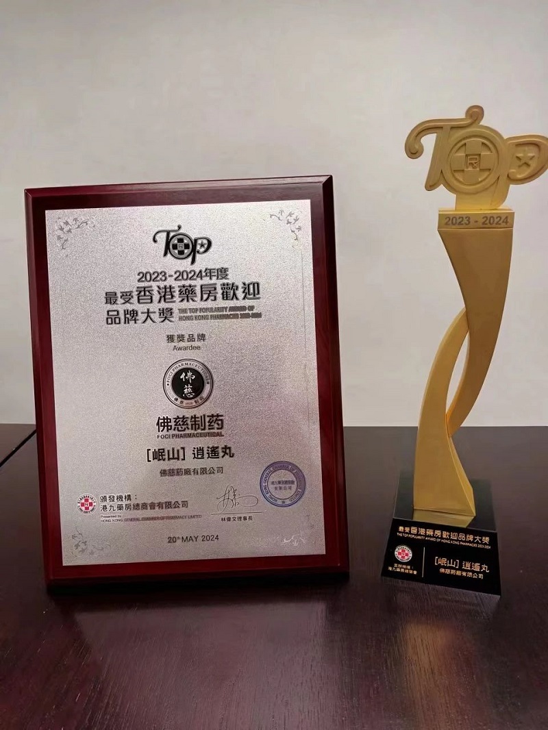 2024年5月20日,由港九药房总商会主办的第7届2023-2024年度《最受香港药房欢迎品牌大奖》评审结果出炉。本年度共有45个品质卓越的产品荣获品牌大奖,涵盖医疗用品、保健品和个人护理产品。其中,佛慈制药生产的“岷山牌逍遥丸”荣获《最受香港药房欢迎品牌大奖》。