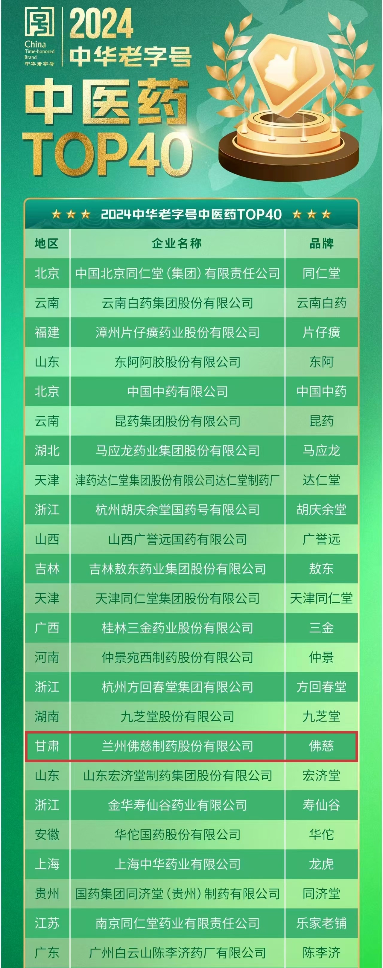 兰州佛慈制药股份有限公司荣登“2024中华老字号中医药TOP40”榜单