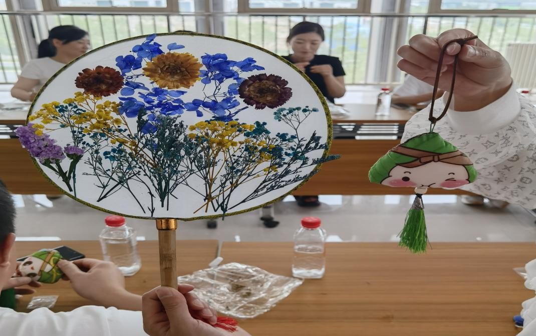 活动现场设置了干花团扇制作、艾草香囊缝制文化体验环节。团扇是中国古代扇文化的代表,有着深厚的文化底蕴,象征着团圆美满之意。员工们把艾草、菊花、丁香等花材沾粘在扇面,选择自己喜欢的素材搭配颜色,充分发挥自己的想象力,通过妙心巧手,一幅幅生动的图案渐渐成型,原本素白的扇面经过制作,都变为独一无二的作品。香囊虽小,却大有学问,一方面象征屈原的品德节操馨香溢世、流芳千古,另一方面又能起到驱瘟避疫、强身健体的作用。大家纷纷拿起手中的布片和艾草药包,经过穿针引线、香包填充、布片缝合,不一会,一个个精致小巧、玲珑可爱的香囊便呈现在大家面前,每个香囊散发着独特的幽香。大家看着自己的DIY手工作品,内心充满成就感,纷纷表示,希望一个个团扇、香囊,带给大家幸福安康,接下来将以更加饱满的精神状态投入到工作、学习和生活中去。