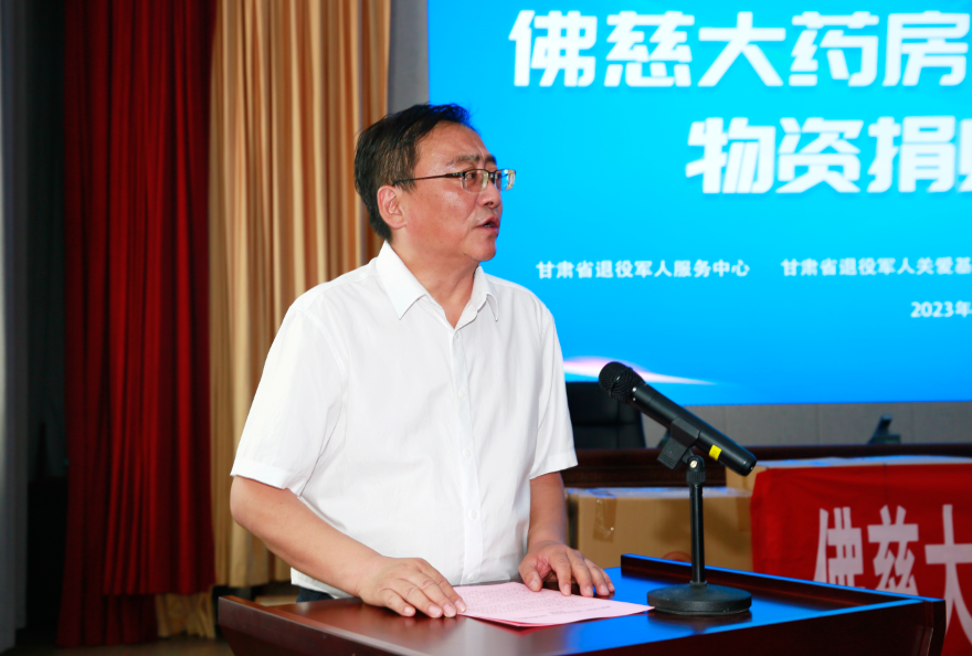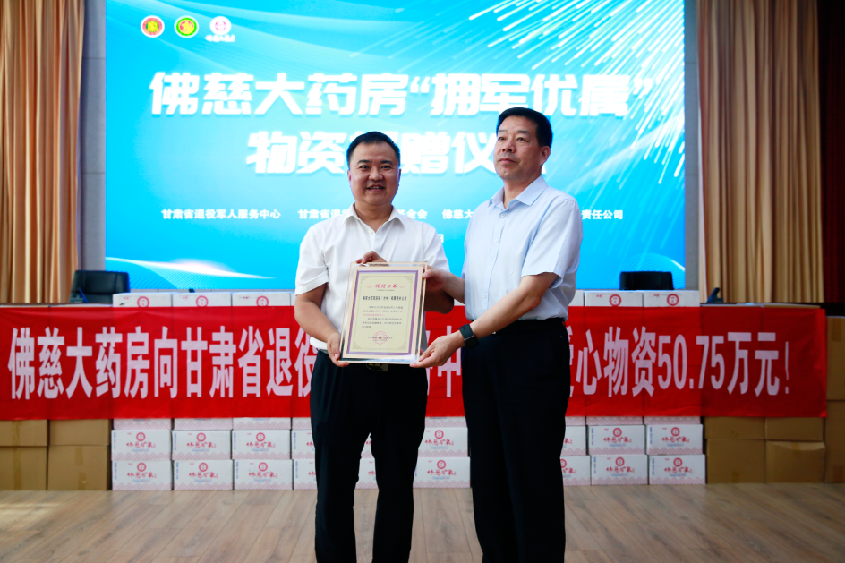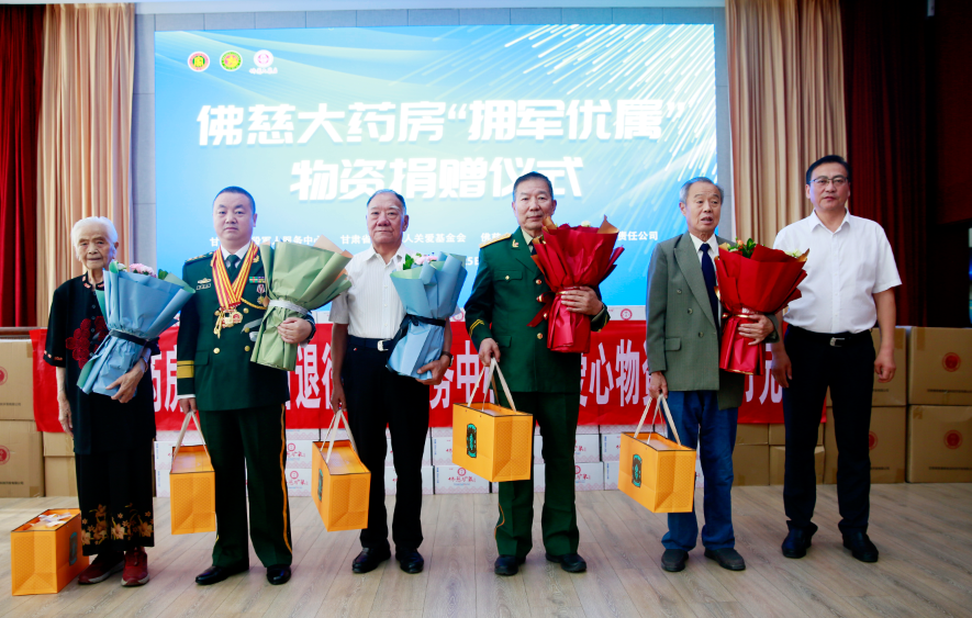 仪式上,甘肃省退役军人服务中心、佛慈大药房连锁(兰州)有限责任公司相关负责人代表双方进行签约,宣布“拥军优属·购药服务再升级”项目正式启动。佛慈大药房还向甘肃省退役军人关爱基金会捐赠价值50余万元爱心物资,将全部用于省内退役军人帮扶援助。崔进泰副厅长向佛慈大药房颁发捐赠证书,并与石爱国董事长一同为功勋退役军人代表发放了鲜花和慰问品。