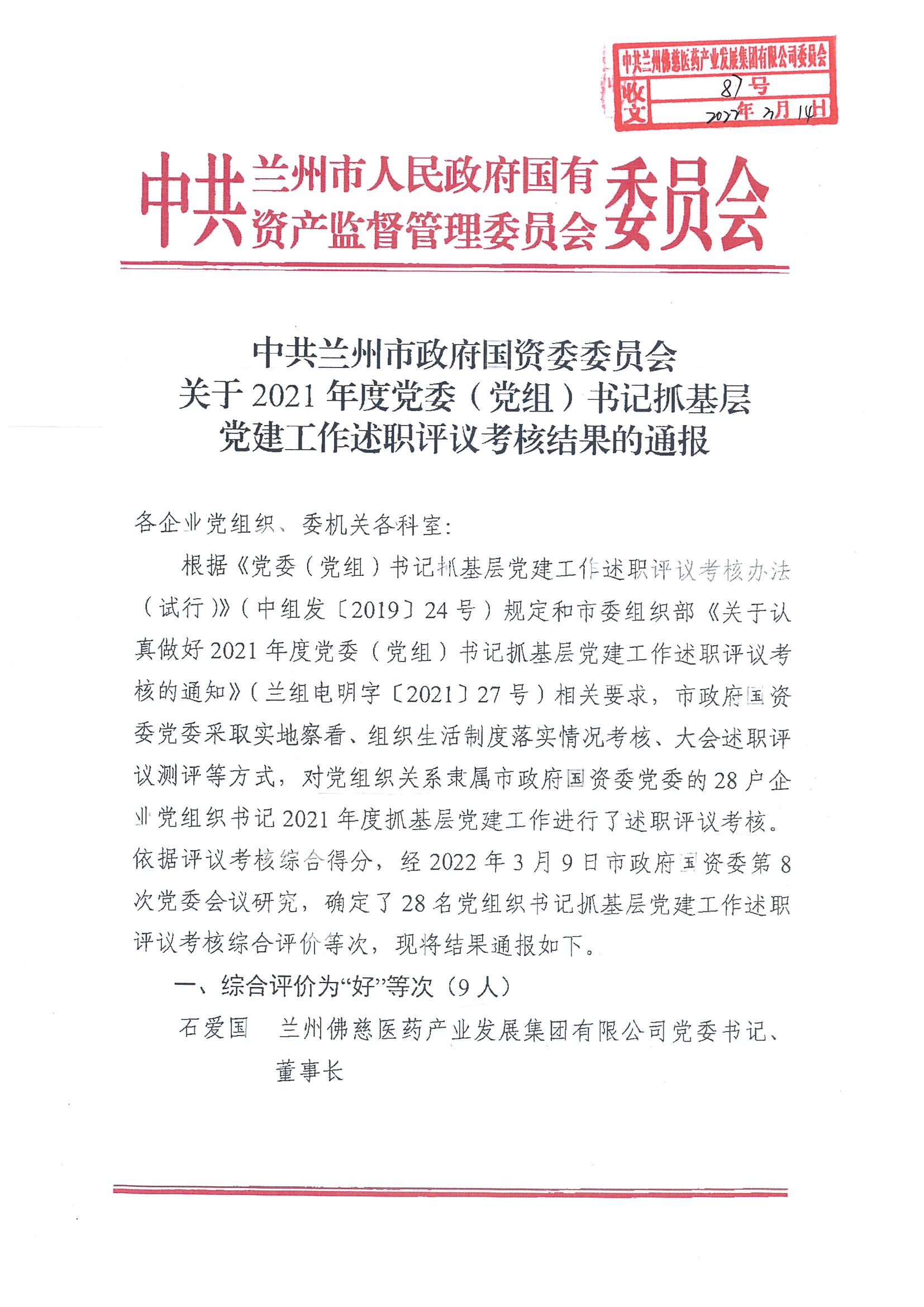 根据中组部《党委(党组)书记抓基层党建工作述职评议考核办法 (试行)》规定、兰州市委组织部《关于认真做好2021年度党委(党组)书记抓基层党建工作述职评议考核的通知》相关要求,市政府国资委党委采取实地察看、组织生活制度落实情况考核、大会述职评议测评等方式,对党组织关系隶属市政府国资委党委的28户市属国有企业党组织书记2021年度抓基层党建工作进行了述职评议考核。 依据评议考核综合得分,经2022年3月9日市政府国资委第8 次党委会议研究,确定了28名党组织书记抓基层党建工作述职评议考核综合评价等次。 综合评价为“好”等次共9人,漫蛙漫画 党委书记、董事长石爱国同志抓党建工作综合评价得分位列第一名, 被兰州市政府国资委党委综合评价为“好”等次。